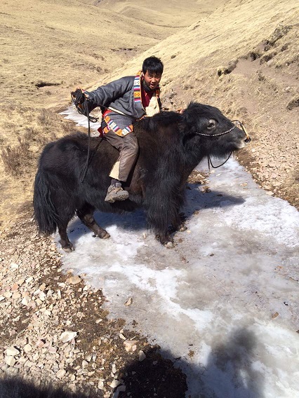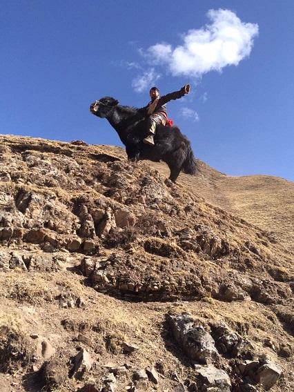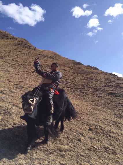 青く澄み渡った冬空の下、高原でヤクを駆る勇姿